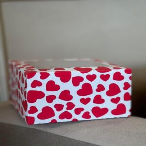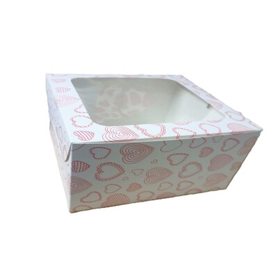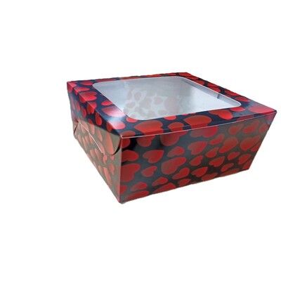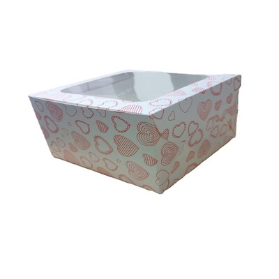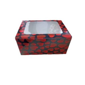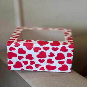 This Valentine-themed cake box with a single window is designed to present cakes beautifully while adding a touch of romance. The clear window highlights the cake inside, making it perfect for gifting and display on special occasions like Valentine’s Day.