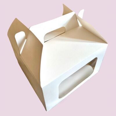 The 8×8×5 cake box is designed to offer both elegance and practicality. Made in a clean white color, it features two transparent windows that beautifully showcase the cake inside. The built-in handle ensures easy and safe carrying, making it perfect for professional and personal use.